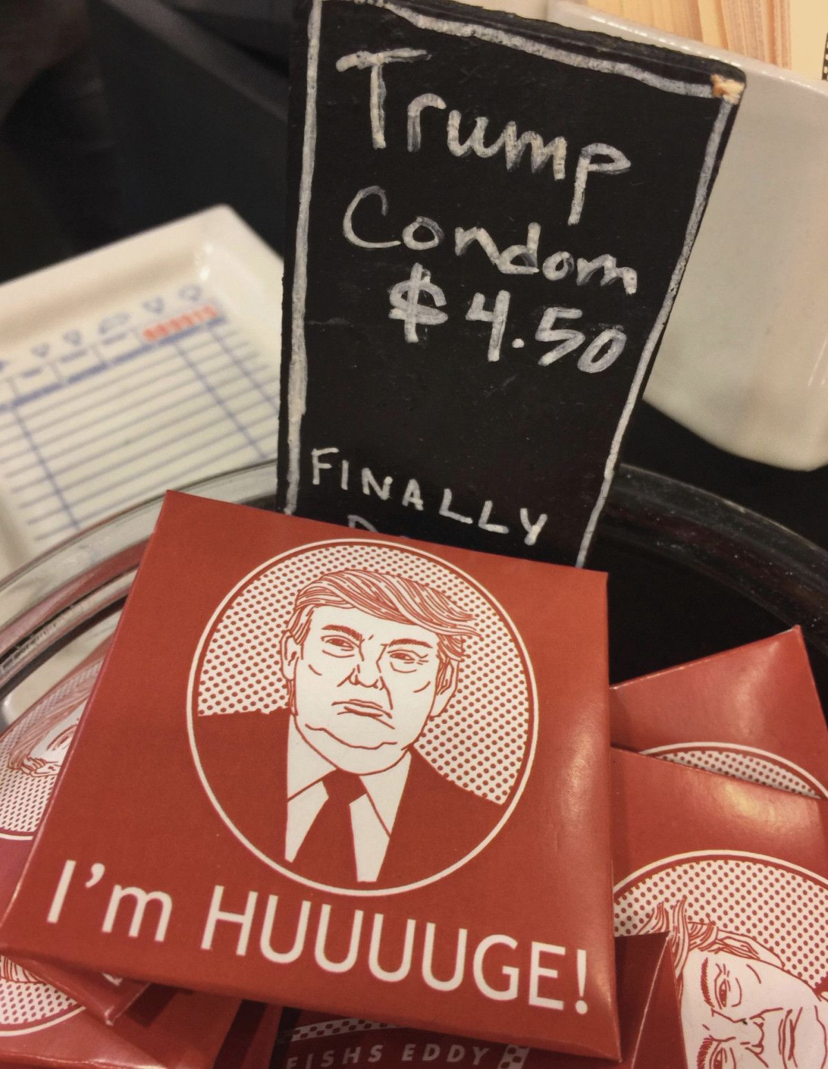 Komitenin servis ettiği fotoğraflar arasında, üzerinde Başkan Trump’ın yüz çiziminin de yer aldığı ve 4,5 dolar fiyat etiketi bulunan prezervatifler de ABD medyası ve sosyal medyada gündem oldu.