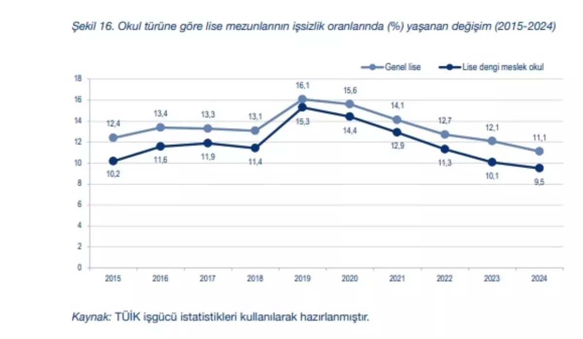 Raporda ayrıca mesleki eğitim mezunlarının yüksek öğretime yönelmesi ve istihdama geçişinin zorluğu ele alınmaktadır. Mesleki eğitim sisteminin güçlendirilmesi ve gençlerin doğrudan istihdama geçişinin desteklenmesi için öneriler sunulmaktadır.