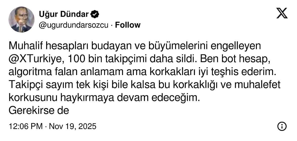 ‘Muhalif hesapları budayan ve büyümelerini engelleyen @XTurkiye, 100 bin takipçimi daha sildi. Ben bot hesap, algoritma falan anlamam ama korkakları iyi teşhis ederim. Takipçi sayım tek kişi bile kalsa bu korkaklığı ve muhalefet korkusunu haykırmaya devam edeceğim. Gerekirse de Amerika’daki gazeteci dostlarıma röportajlar vereceğim.’
