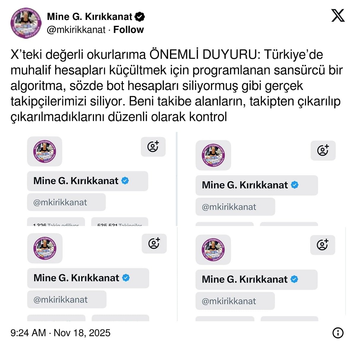 Kırkkanat, takipçi sayısındaki düşüş için ‘X’teki değerli okurlarıma ÖNEMLİ DUYURU: Türkiye’de muhalif hesapları küçültmek için programlanan sansürcü bir algoritma, sözde bot hesapları siliyormuş gibi gerçek takipçilerimizi siliyor. Beni takibe alanların, takipten çıkarılıp çıkarılmadıklarını düzenli olarak kontrol etmelerini ve eğer çıkarıldılarsa sabırla, inatla yeniden takibe almalarını rica ediyorum’ ifadelerini kullandı.