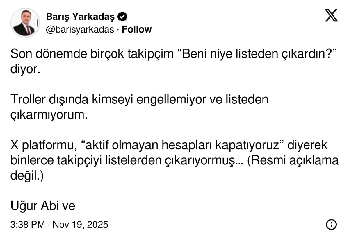 X platformu, “aktif olmayan hesapları kapatıyoruz” diyerek binlerce takipçiyi listelerden çıkarıyormuş… (Resmi açıklama değil.)